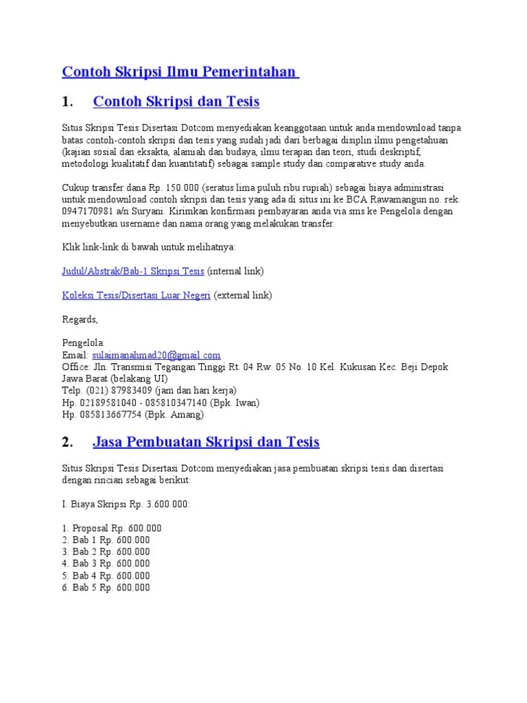 Contoh yang diberikan dalam tulisan ini adalah contoh skripsi ilmu pemerintahan yang mencangkup pada ilmu pemerintahan desa, pelayanan publik, dan lain .